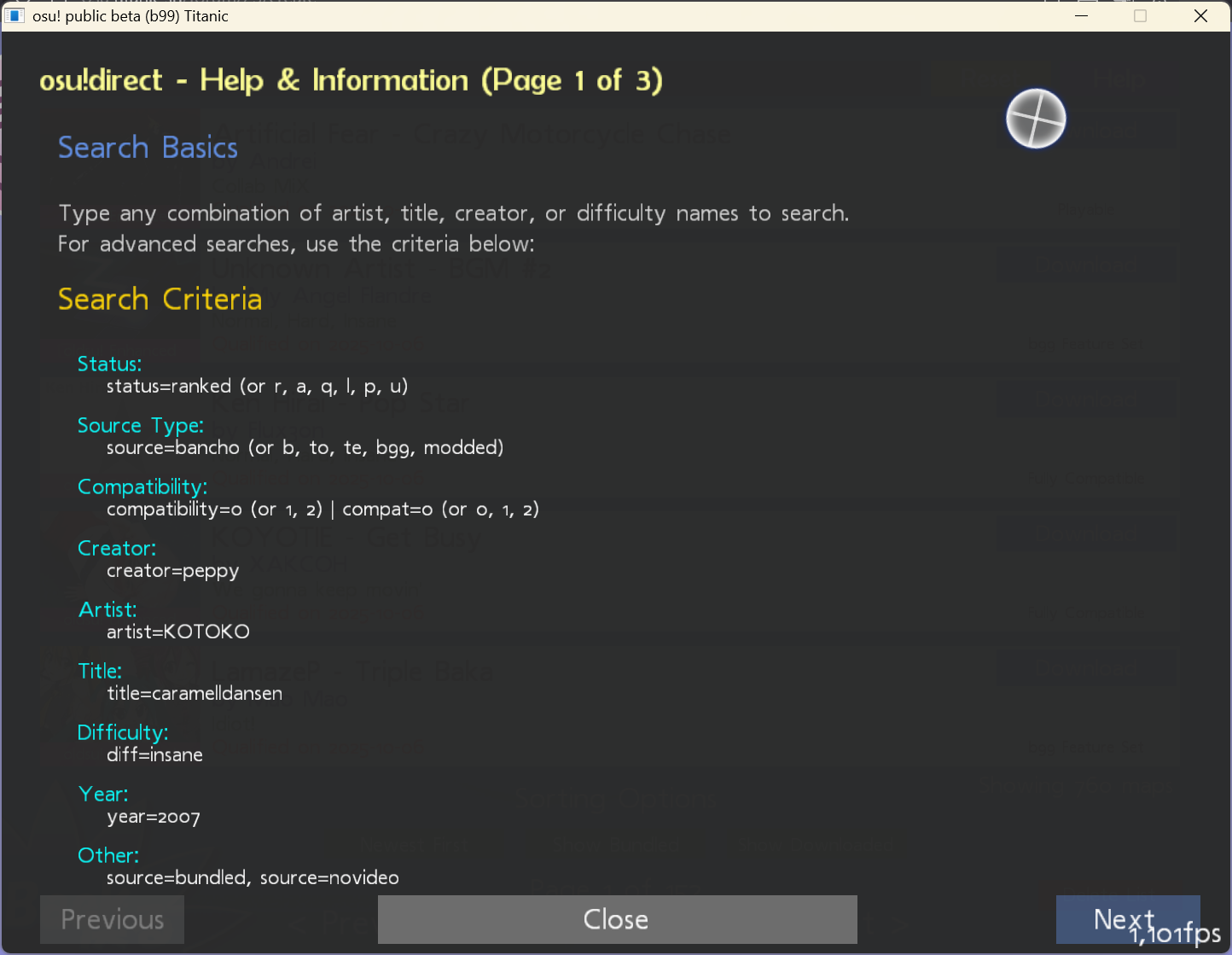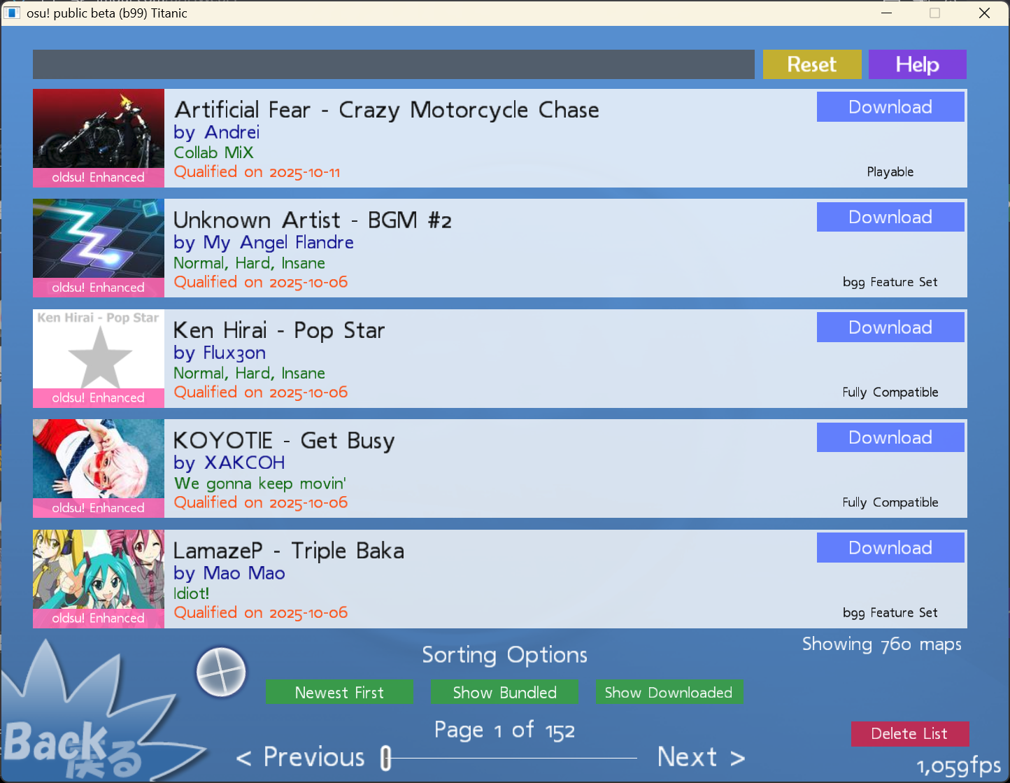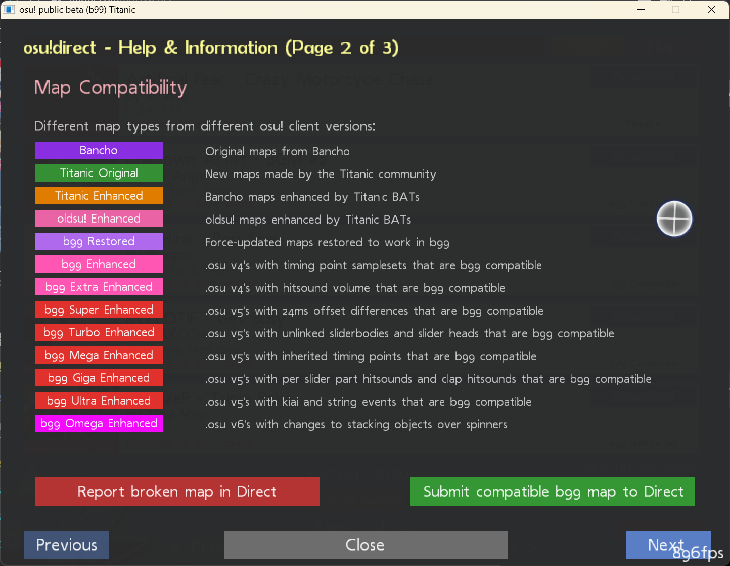 A fully custom version of Direct! This version of Direct includes custom beatmap thumbnails for any maps that did not have them, features for the different beatmap compatibility options in b99, search filtering. Since b99 doesn't support all features from modern osu! we needed to build a custom list of compatible maps for this version of Direct. There are currently a total of 760 maps that can be downloaded (based on your beatmap compatibility settings may be lower). This includes Titanic Original maps, Titanic Enhanced maps, oldsu! Enhanced maps, and Bancho maps! Thanks to vg185 and tree for help with Direct!