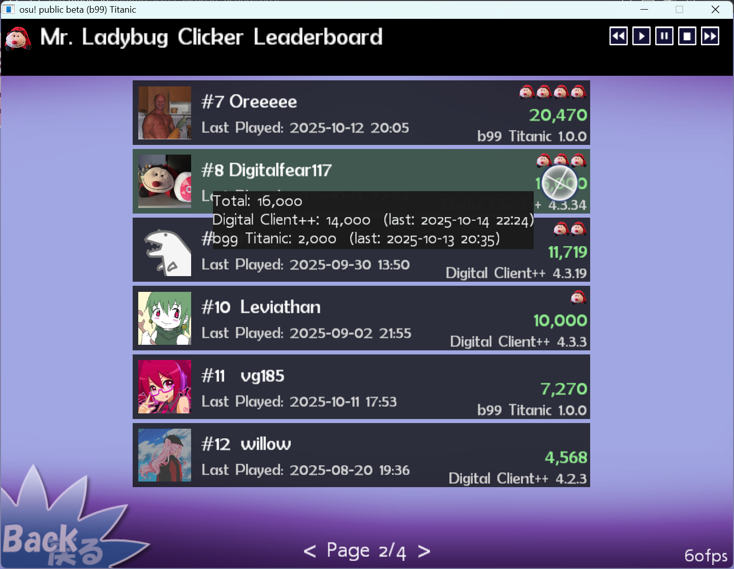 Fully backported from Digital Client! Mr. Ladybug Clicker has been updated so that you can see which client you submitted your clicks from! Hover any score on the leaderboard to see!