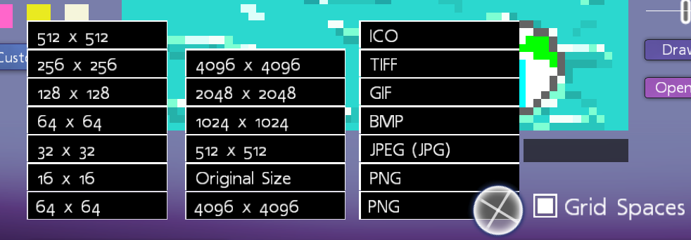 This is a fully featured pixel art designer! You can change your canvas size, image export size, and image export file format!