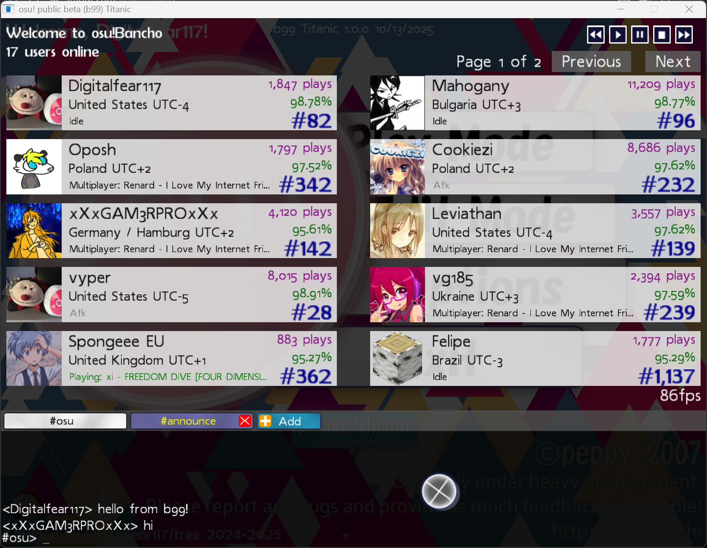 b99 is so old that it actually used irc to connect to osu!'s online services, NOT bancho! Tree worked hard to make a custom client side re-implementation of bancho so that this client can connect to Titanic! This version of Bancho support messaging, channels, private messages, and more!