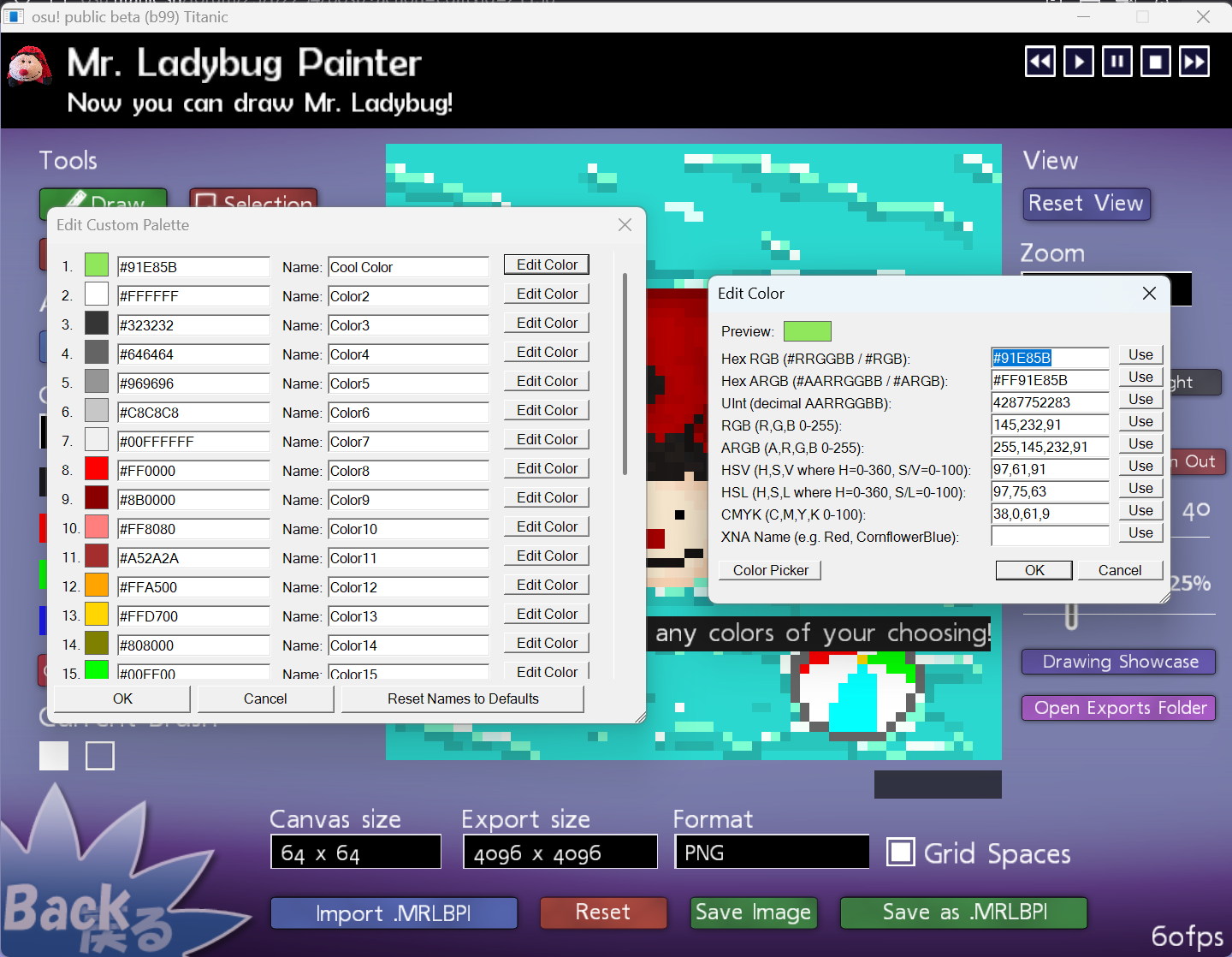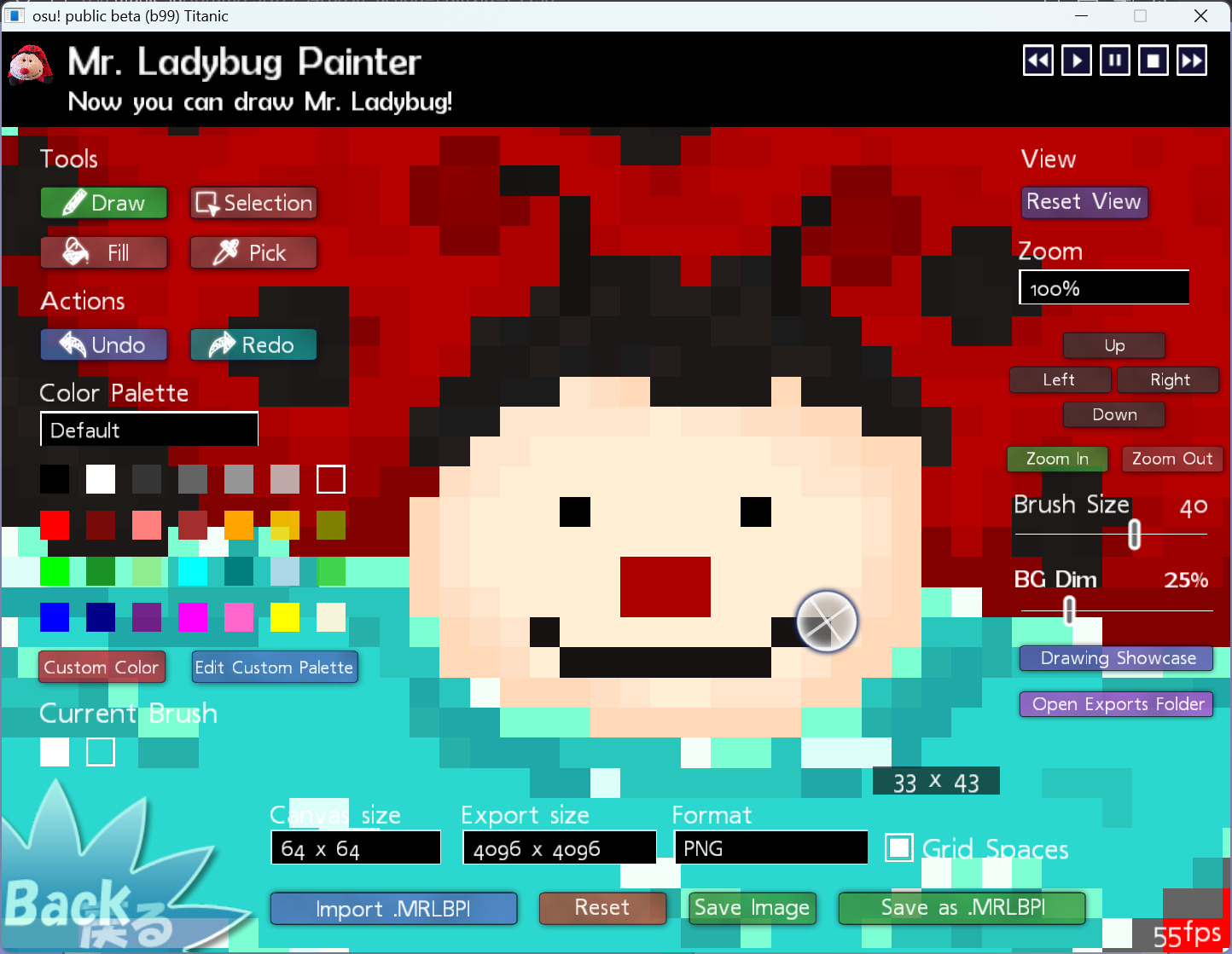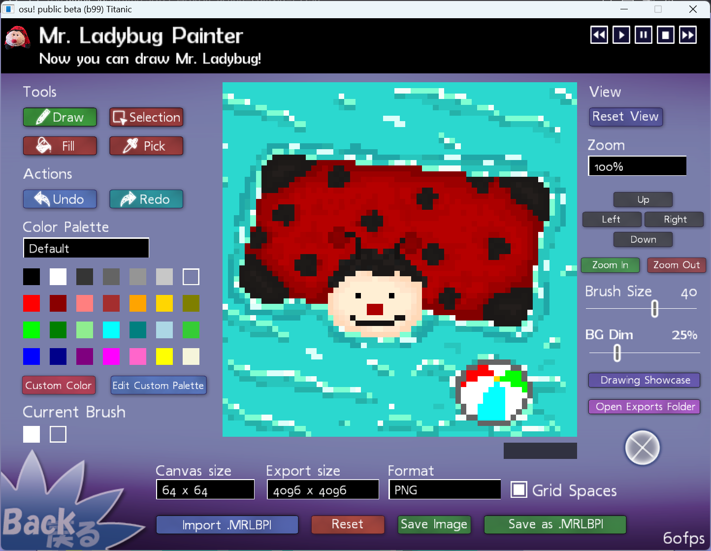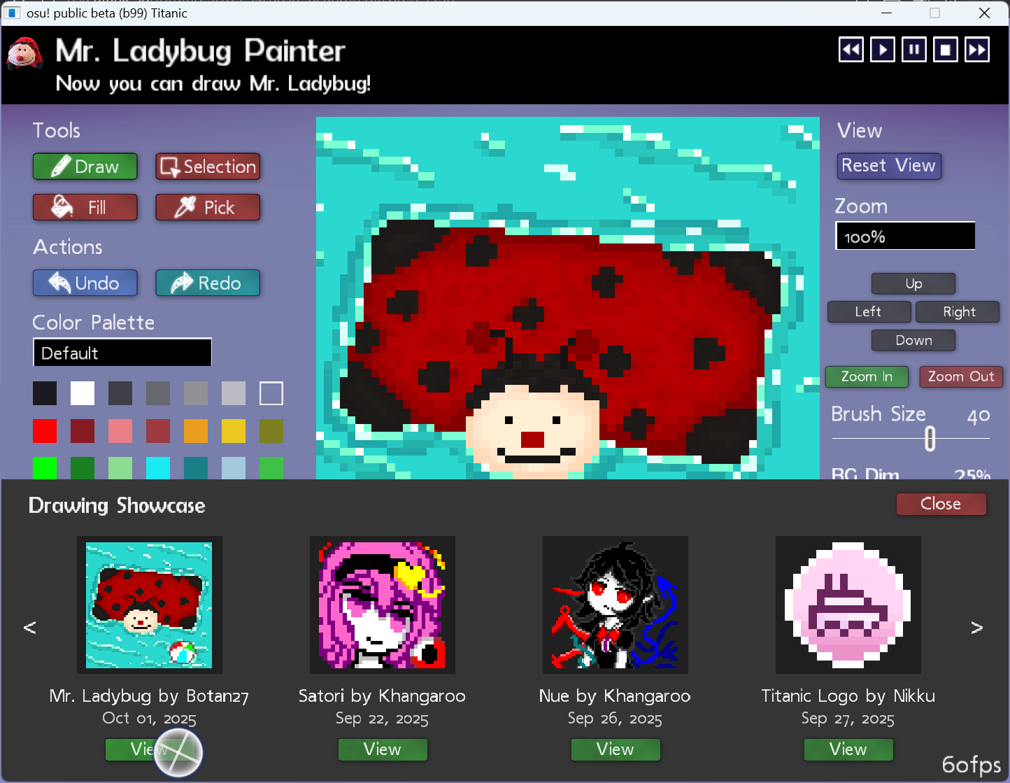 Create your own drawings in Mr. Ladybug Painter within the next two weeks (10/13/2025 through 11/04/2025). There will be a forum post where you will post your drawing using the "Save as .MRLBPI" option. Then from 11/04/2025 through 11/11/2025 everyone will be able to vote on their favorite drawings! The best drawings will be picked and included in order of votes in later version of both b99 and Digital Client! https://osu.titanic.sh/forum/25/t/2256/
