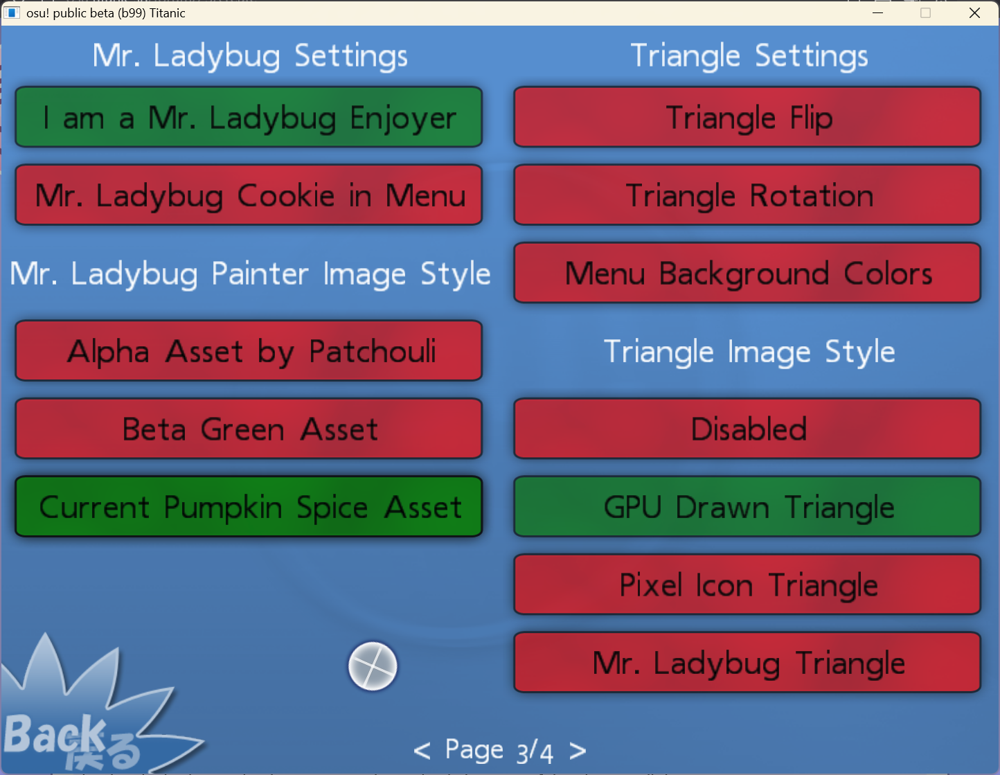 Mr. Ladybug Enjoyers have access to Triangles, backported from November 2014 Clients! They can be customized. Some of the rewards from Mr. Ladybug Clicker can also be enabled in this client!