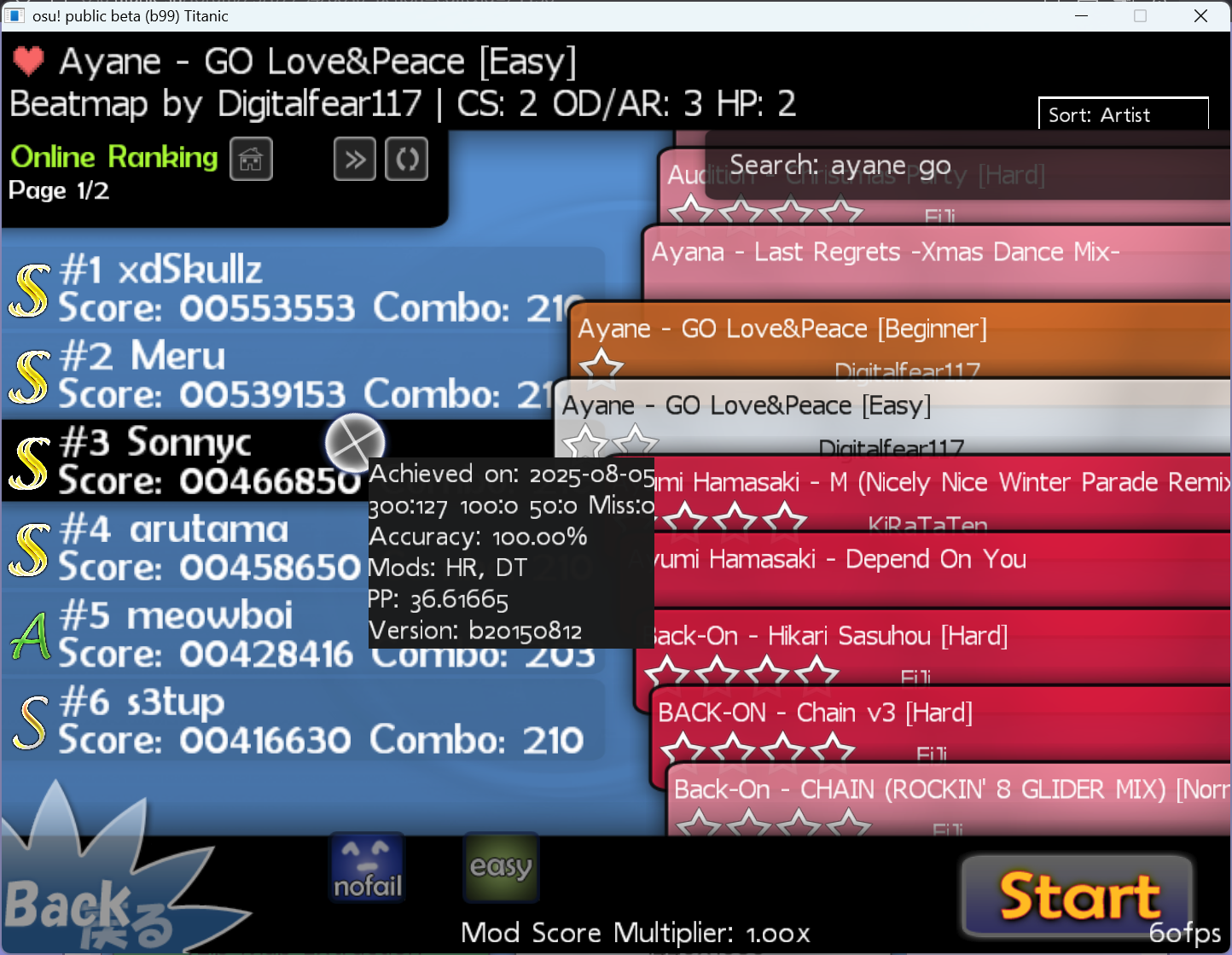 Song Select in b99 was super basic, no sorting, no search, you couldn't even navigate it with the arrow keys. Not only that, there was no way to see what CS, HP, or OD the map was, or the ranked status! All of that has been changed in b99 Titanic! Thanks to gsxr4o0 for the custom ranked status icons!