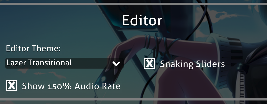 You can now use up to 150% Audio Rate in the Editor! This is only available when using the 2013, 2014, Lazer Transitional, and Hexis Editor themes! If you don't want to see this, it can be disabled in the Editor section of the Theme Tab in Settings