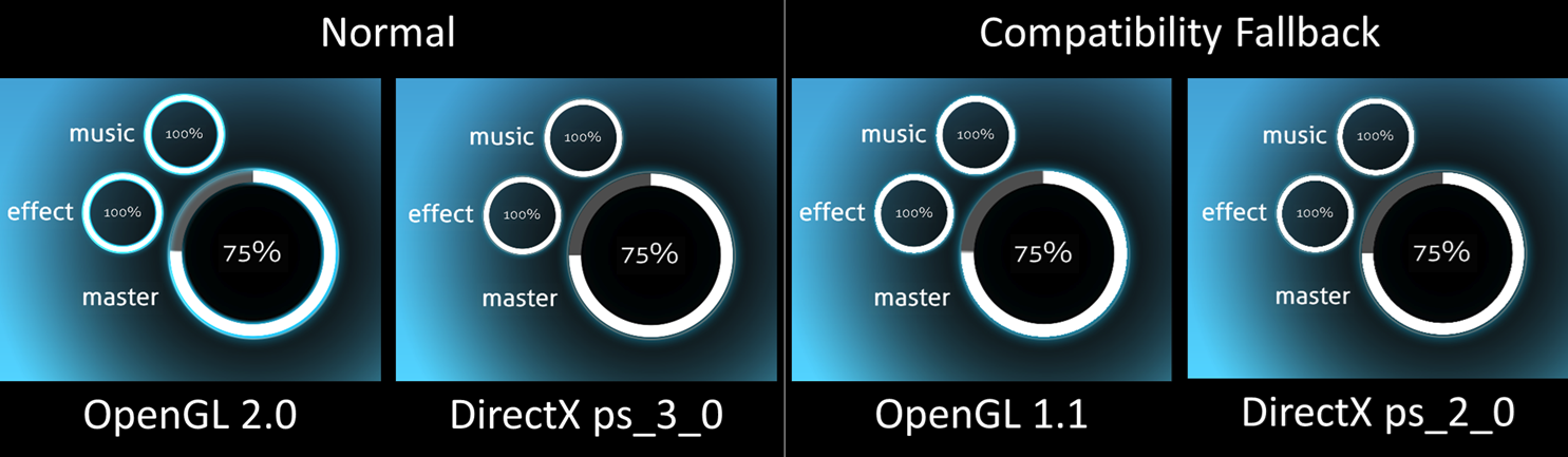 Unlike the Triangle Style Adjuster, this one actually uses Shaders in Stable to draw the progress circle. That's why it was not possible to properly recreate it until now! The OpenGL 2.0 is basically Stable's with a few tweaks, and the DirectX ps_3_0 one is my recreation for DirectX. If your GPU was made after 2005 you will only ever see those two. I also created an OpenGL 1.1 recreation (COMPLETELY SHADERLESS! OpenGL 1.1 does not support shaders!), and a ps_2_0 Version for GPU Hardware made before 2005 that supports DirectX9! So 3/4 of these are completely custom!
