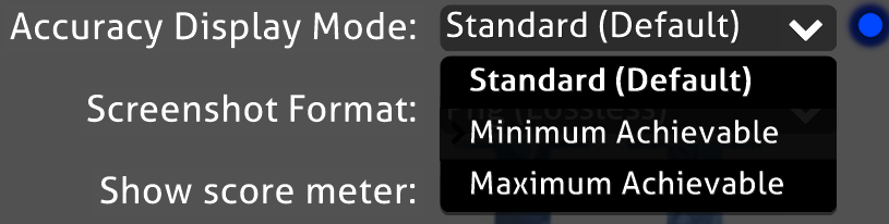 You can now change how accuracy is display in game for all game modes! Instead of displaying accuracy as being 100% till you make a mistake, you can change it between 3 options! Standard (Default), Minimum Achievable, and Maximum Achievable!