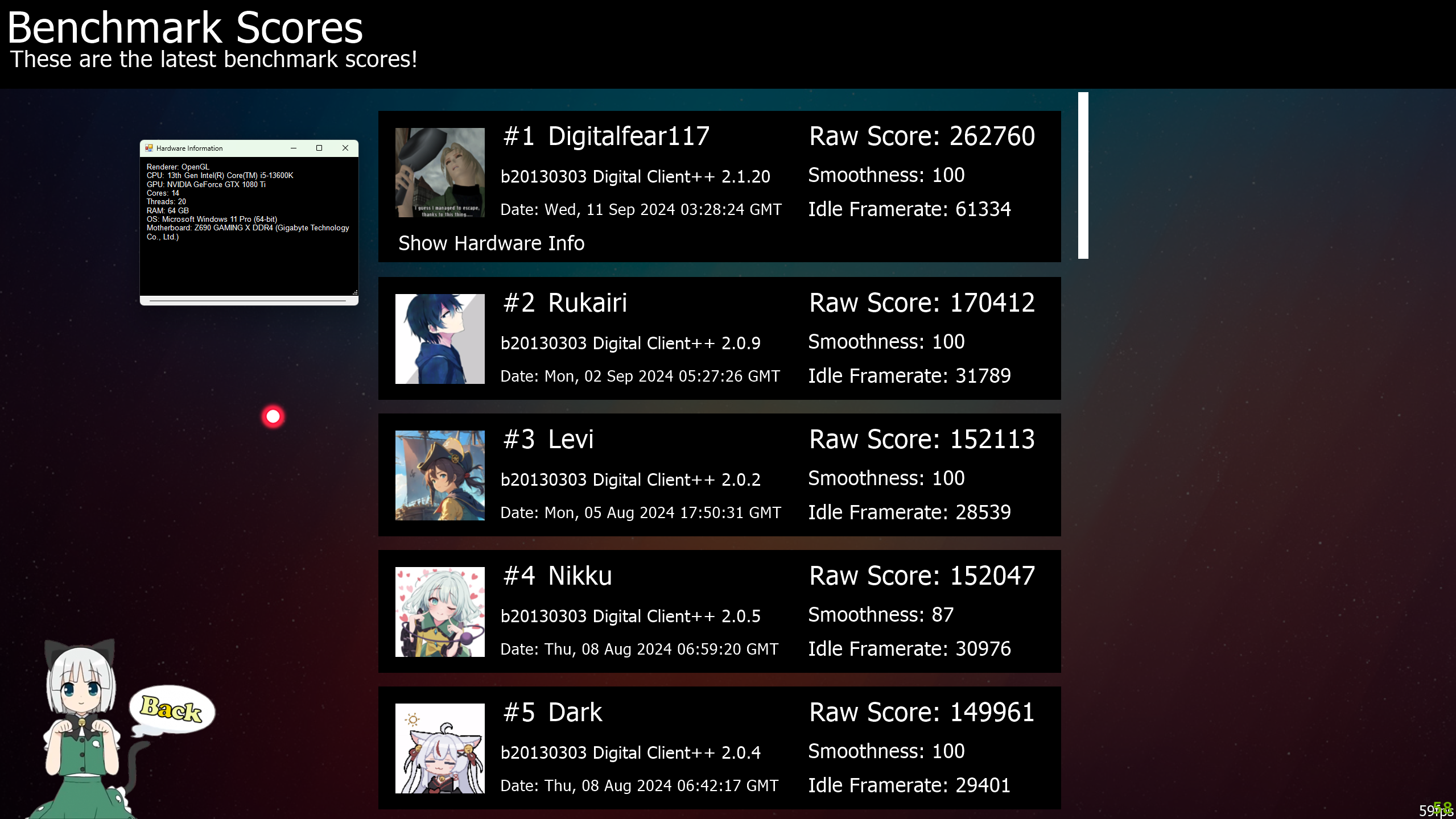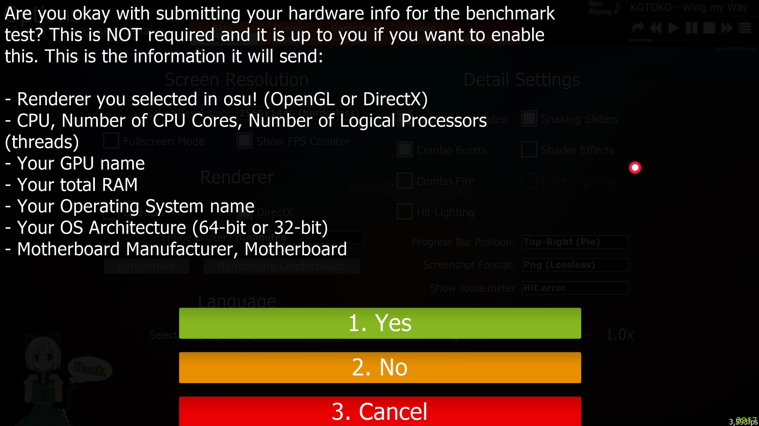 1. Temporarily remove fonts, backgrounds, skins and songs folders so the client doesn't load them and waste CPU cycles 2. Close down everything else 3. Consider doing overclocking, at your own risk. 4. Rerun benchmarks, you might get a better score. Linux hassle level stuff: 5. Consider running on LTO+PGO optimized Gentoo install for your CPU architecture, if you can. 5.1. If you don't want to hassle with Gentoo, consider just self-building linux-tkg kernel and wine-osu-spectator for your CPU architecture. 5.2. If you use Arch Linux, consider using ALHP (unstable) or CachyOS (more stable) packages for extra performance 6. INCREASE audio buffer size to reduce CPU instructions required to push audio to buffer. This is applicable to "Linux low latency audio on osu!" guys 7. Consider running on a basic window manager, such as Openbox without compositors 8. Run osu! through gamemode wrapper, might help
