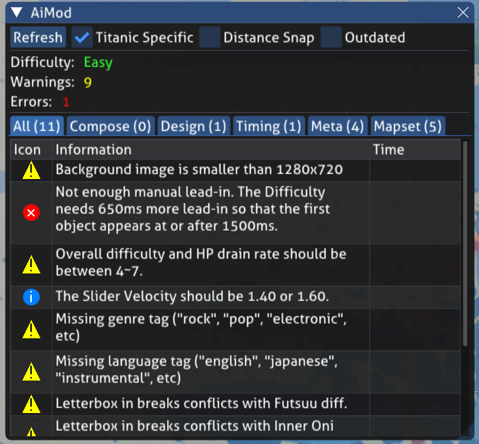 AiMod got a huge glow up! There are now new checkboxes to enable and disable specific types of checks! Most importantly, you can disable the outdated checks, and even disable Titanic specific checks if you are making maps for Bancho instead! osu! will remember which ones you had enabled on restart too, and this works on both versions of the form!