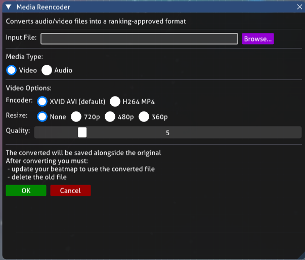 MediaReencoderForm got new features and bugfixes! Now you can rescale videos now with it as well! It also got a new ImGui version too! For those who don't know, Digital Client has a feature to convert audio and video files to Ranking Criteria Standards for both Bancho and Titanic!