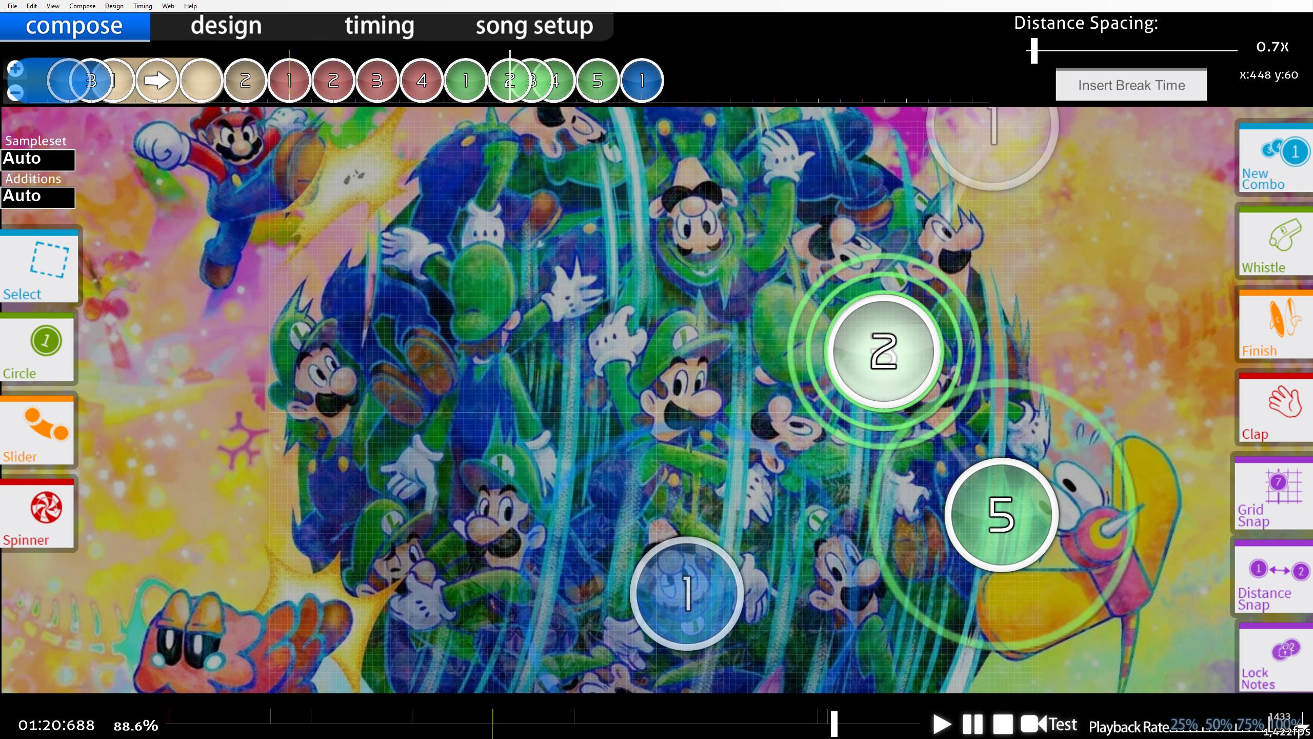 INSANE 00:13:494 (2) - This is the start of a slower, less intense section, i think the spacing of this note is a bit large for this kind of section, especially considering most notes in the more intense section has less than 2.00 distance from each other. The distance between these is better 00:15:024 (1,1) - This was a mistake. Fixed.00:26:810 - is missing (Whistle) which exists in Expert 00:27:116 - is missing (Whistle) which exists in Expert Could you clarify these? The objects do have whistles, so I'm not sure what you mean.01:09:208 (4) - Not sure if this was intentional, maybe make this a linear or bezier if you don't want the slider ball to stutter at the end. Alternatively you could move the anchored control point to x:312 y:304, and then add a regular control point to x:312 y:284 Fixed 01:16:861 (3) - This is subjective, but I feel like this slider is a bit uncomfy, maybe you should turn it more towards the next pattern, but keep the distance the same Fixed, I think01:20:535 (1,2,3,4,5,1) - I think this ending could be a little more spaced, feels a little anticlimactic to me like this, especially the distance between 01:20:841 (4,5). Maybe try something like this? True. I reworked the pattern a little bit, so that the beginning part isnt too intense but the ending is harder. EXPERT 00:19:310 (6,7) - I know this is an expert diff, but the spacing here seems really large for a section where most bursts lack movement at all. nerfed00:26:657 - is missing (Whistle) which exists in Insane, Ultra 00:26:963 - is missing (Whistle) which exists in Insane, Ultra again, unsure what this means00:41:810 (4,1,2,3,4,5) - I think the large distance gap between 4 and 1, with the direction change snap that will happen with players following the burst is too much at once. I think 1-5 should either be following a more linear path to the previous 4, or you should bring 4 and the patterns of 1-5 closer FixedHow come this has so much spacing 00:46:555 (6,7) - but everything here has like none? 00:45:177 (10,11,12,13,1,2,3,4,5) - seems weird to me Fixed, this wasn't on purpose I think lol01:06:453 (1,2) - I just think the slider going down, and the next note being up is uncomfy, completely subjective though. I think this is reasonable slider leniency abuse for this level of difficulty 01:20:535 (1,2,1,2,1) - This is a cute pattern, but I wish 01:21:147 (1) - had more spacing than 01:20:841 (1,2) - did. Tried something 00:27:116 - is missing (Whistle) which exists in Expert Again unsure what this means 00:28:494 (1,2) - and 00:28:800 (1,2) - These are perfect curves, maybe change these to linears fixed, somehow reverted this when i fixed it earlier lol00:45:179 - Circle unsnapped by 2 ms. fix00:45:331 (13) - NC here As with the previous streams I prefer leaving the stream on these held guitars as one combo since I think it's kinda cool. If I changed this I'd change all the other ones, but I think I would prefer not to for now.01:00:943 (1,6,11,16,21) - I think it would be cute to make these all new combos agreed01:04:004 (1,2,3,4,5,6,7,8,9,10,11,12,13,14,15,16,17,18,19,20,21,22,23,24,25,26,27,28,29,30,31) - Please break up this massive combo with a new combo Similar argument to before. It is a very long combo, yes, but it is also a very long held guitar note. The comboing reflects this. If it's something that is too big an issue I'd be open to changing and redesigning the comboing on these long streams but this was a conscious decision I made