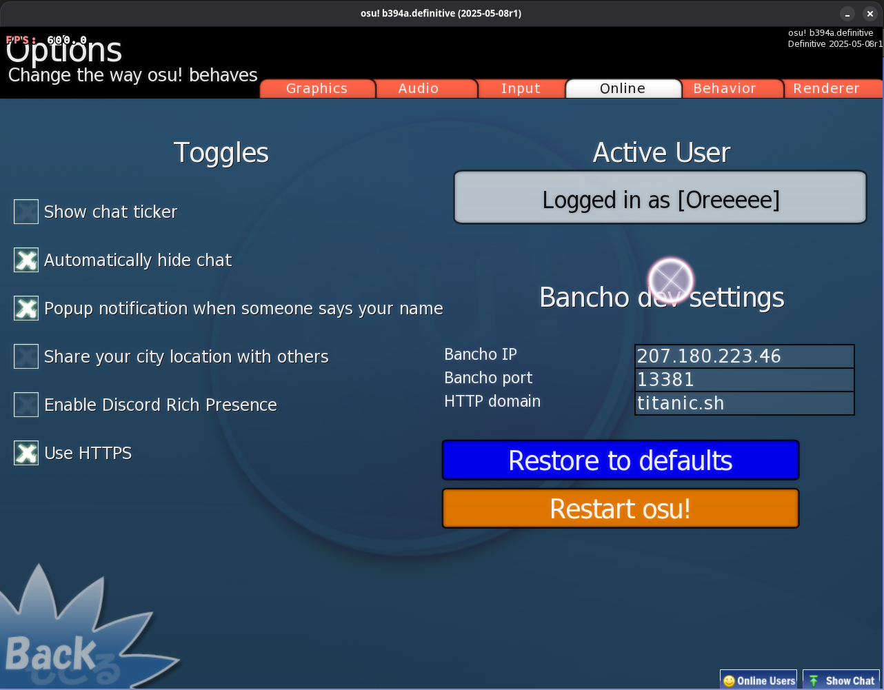 Go to settings -> online, set the Bancho IP to 207.180.223.46, click Enter, and click Restart osu!. It will now be possible to connect to servers once again.