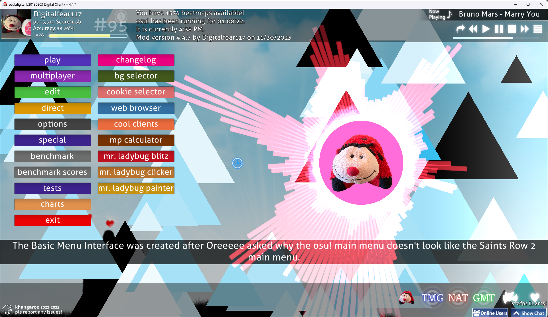 Change the main menu buttons to any one in osu!'s history. This includes new custom ones as well for "Special" as the 2007 and 2014 clients never had these