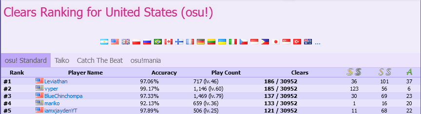 Detailed StatsRanked Score: 1,539,163,290 (#53)Hit Accuracy: 97.66%Play Count: 3,649Play Time: 50.4 hoursTotal Score: 2,983,442,098 (#64)Current Level: 76