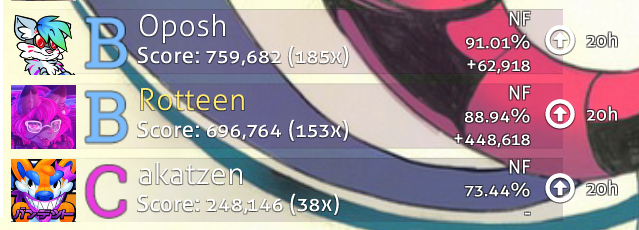 Detailed StatsRanked Score: 1,521,667,483 (#11)Hit Accuracy: 99.6%Play Count: 719Play Time: 13.3 hoursTotal Score: 1,947,042,323 (#14)Current Level: 66