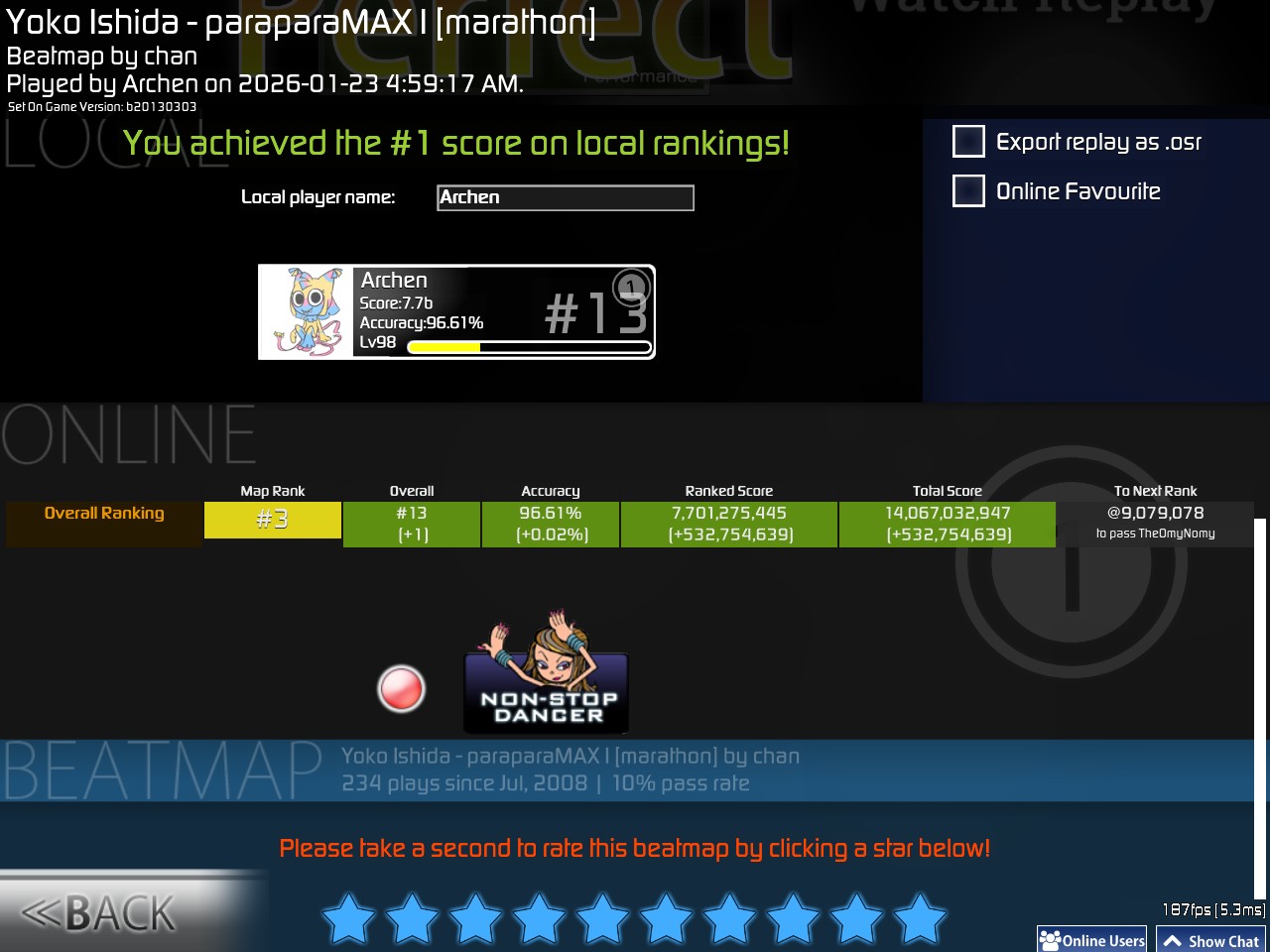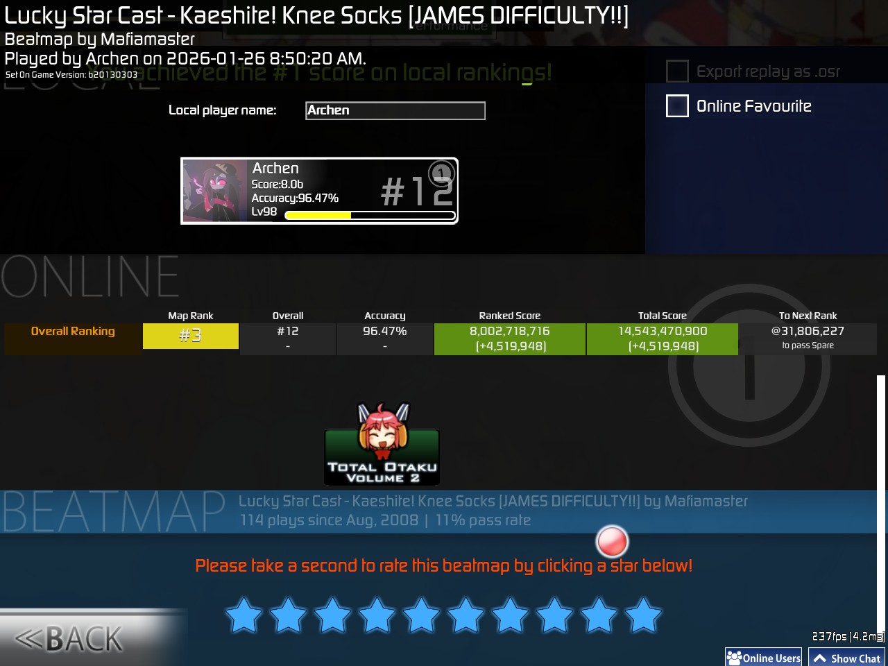 Archen has risen 1 rank, now placed #275 overall in osu!. |